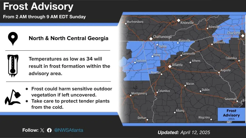 A Frost Advisory is in effect from 2 a.m. until 9 a.m. Sunday for Floyd, Bartow, Chattooga, Gordon, Polk, and Paulding Counties.