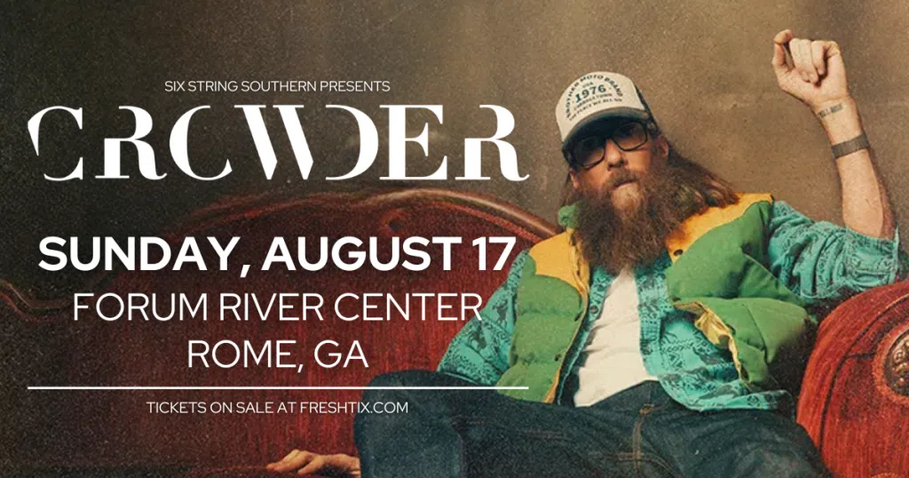 Six String Southern Productions and the Forum River Center are pleased to announce Crowder will perform live at the Forum River Center on Sunday, August 17, 2025. Tickets go on sale to the public on Wednesday, June 11 at 10 AM at Freshtix.com or by phone at 678-701-6114.