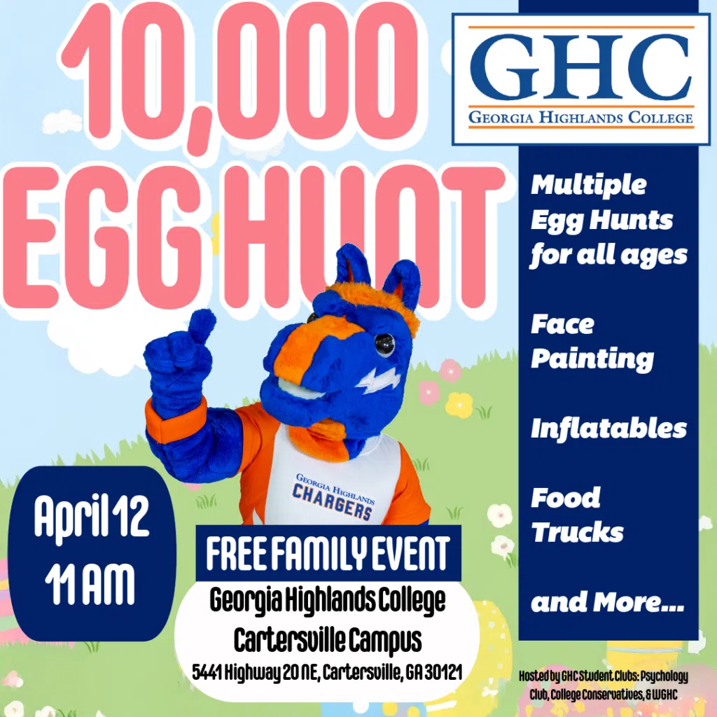 Georgia Highlands College invites the community to the 10,000 Egg Hunt, a free, family-friendly event featuring multiple egg hunts for all ages, face painting, inflatables, food trucks and more.