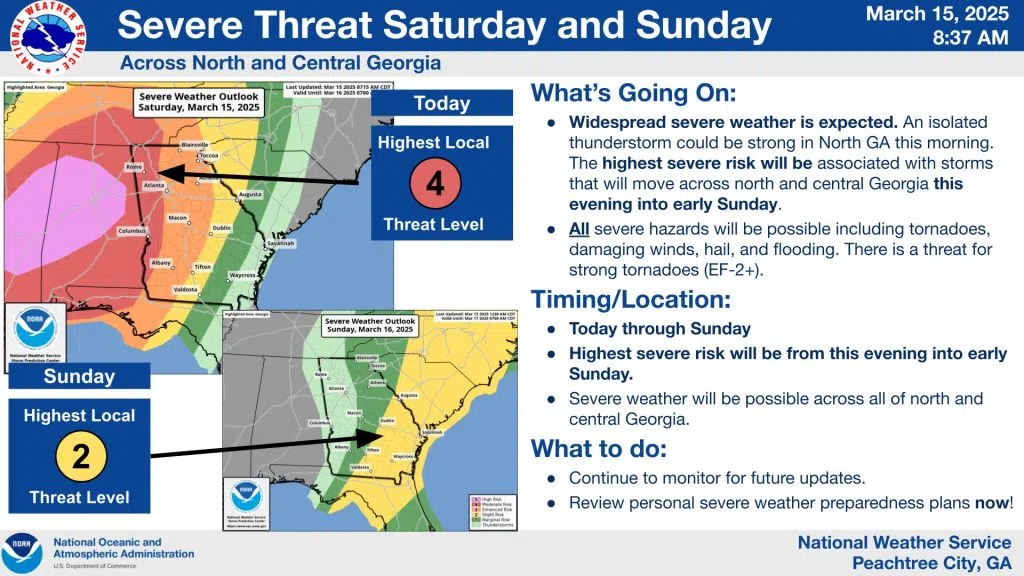 Northwest Georgia is at a moderate risk (level 4 out of 5) for severe storms from around 8 p.m. Saturday until 8 a.m. Sunday.
